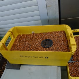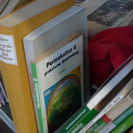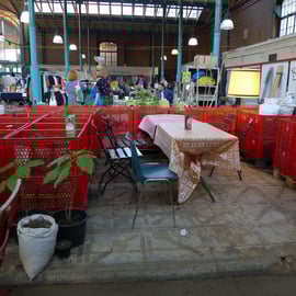 Und in alten Postkisten wurde Pflanzgranulat gewässert- leider konnte ich niemanden fragen, wofür es gebraucht wurde. Da es der letzte Samstag in den Hallen war, wurde ein Flohmarkt zwischen den ganzen Hochbeeten aus Bäckereikisten und Baugerüsten an denen Leuchtstoffröhren befestigt waren, veranstaltet. Eine sehr gelungene Grünoase in der Stadt. Es liegen Bücher bereit über Permakultur und Gärtnern, Postkarten, auf denen man zu Beetpatenschaften aufgerufen wird und wie man einen Kartoffelsack anlegt. So kann man auf kleinster Fläche und sehr unkompliziert (nix mit Reihen, Furchen und Sauhaken) Kartoffeln säen und ernten.