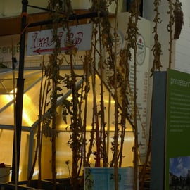 Ich habe mich mittags aufgemacht und musste leider feststellen, dass an der Ecke Moritzplatz noch keine Prinzessinnengärten waren. Dafür hat eine nette Passantin mir gleich Auskunft gegeben, dass diese noch in der Markthalle in der Eisenbahnstraße seien. Dort angekommen gab es viel zu sehen: Amaranthpflanzen, Kartoffeln, die zum Keimen in Eierkartons lagen, ein beleuchtetes Gewächshaus, das erstmal gut aussah, aber ich bin mir sicher – noch besseres beherbergt. Am Tresen wurden Metaschnecken feilgeboten, nein quatsch Hefeschnecken.