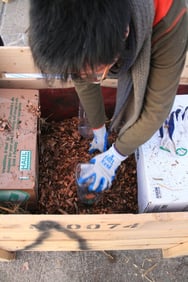 To prevent leaking, first we lined the box with a piece of tarp. We filled in some cardboard, soil, woodchips and straw to cover the bottom.