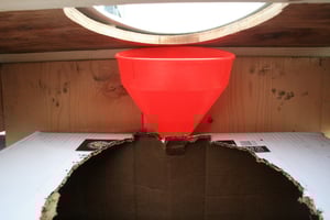 without any congestion we put a tee-piece to the funnel, so two tubes for each funnel transport the urine to the bottles in the mulchbed. The funnel with the tee is placed in front of the