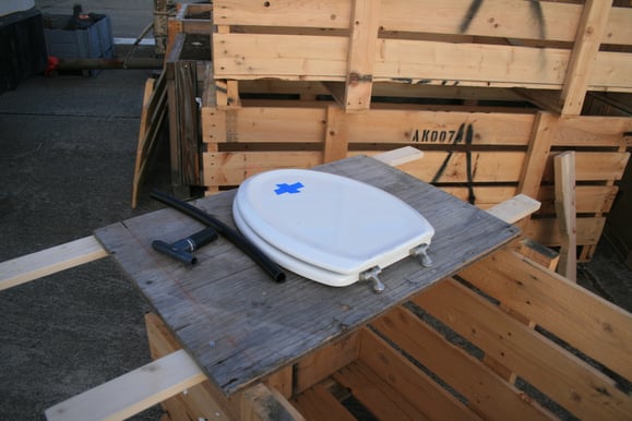 Then we mounted the toilet seats. Important to keep out flies: find toilet seats that are as flat as possible, we want no gaps, neither between seat and platform, nor between seat and lid. We